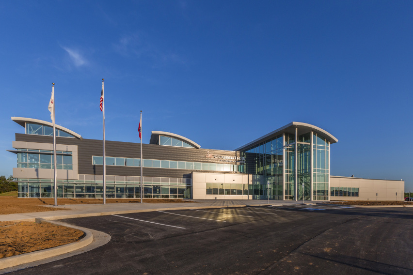 The two-story office/administrative area is the focal point of the building and includes a fitness center, locker rooms, and a café with computer stations and conference rooms. The administrative area is a conventional steep structure with curtain wall and high-end metal panels.