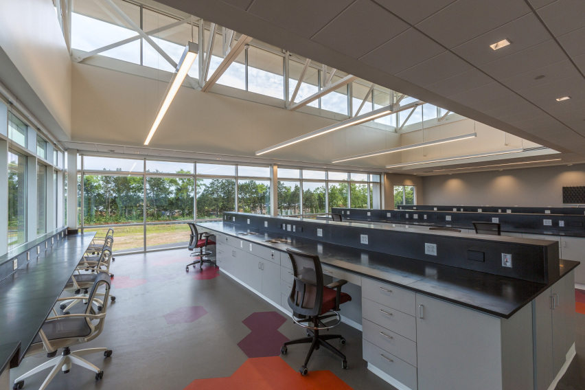 The single-story production area includes a research and development lab that is accessible via a central spine. The production area has load bearing tilt-up panels with joist and metal deck.