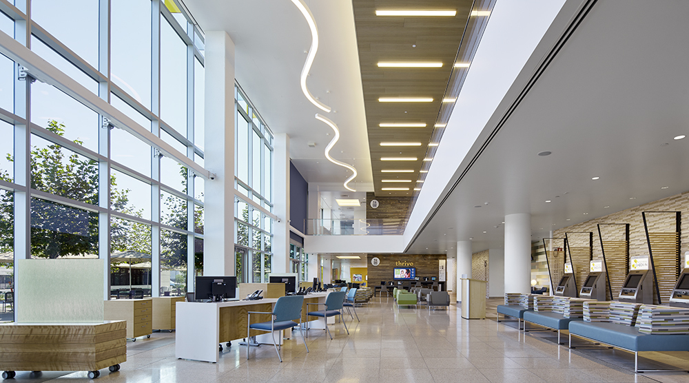Sustainable features include two separate green roofs accessible to staff, and a site design with "Thrive" paths throughout for walking, a yoga lawn, and permanent exercise equipment. The majority of the provider offices are built using DIRTT demountable fabric and glass walls to allow for flexibility.