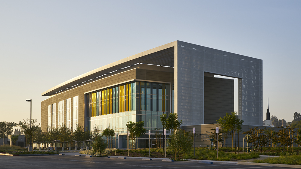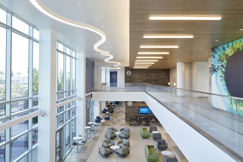 The LEED Platinum Baldwin Hills Crenshaw Medical Center was designed and built as a Kaiser Permanente Health Hub, a right-sized medical office space in an environment organized to efficiently accommodate complex care. More than eighty provider offices are located in the four-story building providing both primary and specialty care services to patients. The two-story Reception Area known as the "Public Square" offers comfortable lounge settings with plentiful sunshine through a twenty-five-foot wall of glass and sits on a raised terrazzo floor. Recycled barn siding, limestone, and glass mosaic tile provide warmth, texture, and sparkle that creates a welcoming atmosphere.