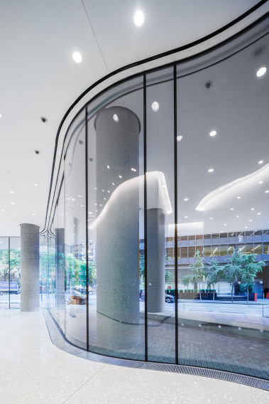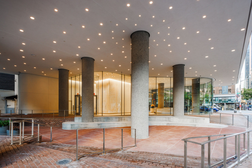 The ceiling was redesigned in all white to ensure continuity between the interior and exterior ceilings. New LED lighting was installed, brightening the lobby and the adjacent plaza.