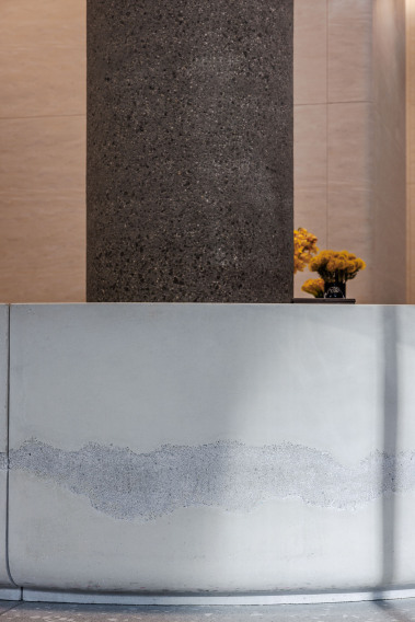 The floor was redone in a modern light-gray terrazzo, which complements the custom-made concrete desk and epoxy desk, which was manufactured in Virginia. Additionally, the team visited the production site to ensure that it was true to the design intent and met the project schedule.