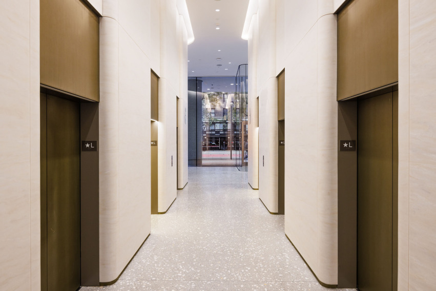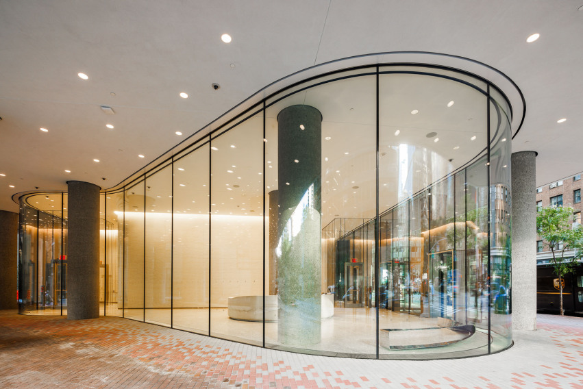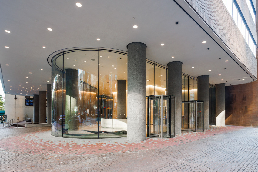 The centerpiece of the lobby involved replacing the small glass pieces on the facade with 19-foot-tall curved glass panels, with no intermediate mullions, that were manufactured and shipped from Germany. These panels, created with cutting-edge technology, create a unique, piano-shaped lobby area and usher in ample natural light to the space.