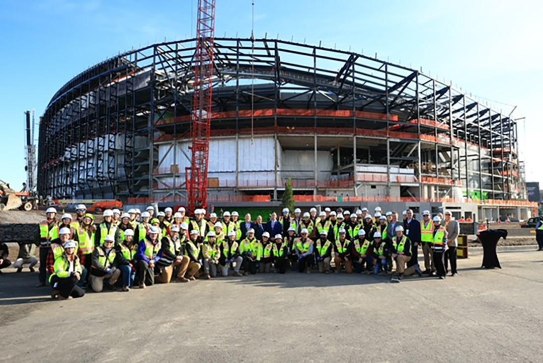 Workers placed the last piece of structural steel atop the 156-foot-high stadium structure as part of the ceremony. The final beam was accented with an American flag, the New York State flag, and an evergreen tree, signifying good luck and prosperity for future building occupants. Before this morning's ceremony, hundreds of partners, employees, and stakeholders signed the final beam.