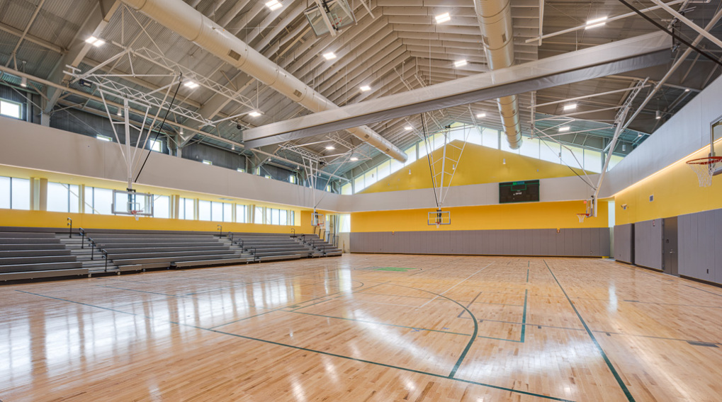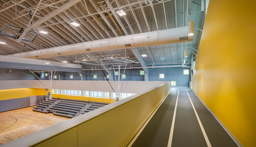 Above the gym, an indoor elevated walking track offers a year-round space for exercise, while a rooftop patio provides an open-air area for events, classes, or just a quiet moment with a view.