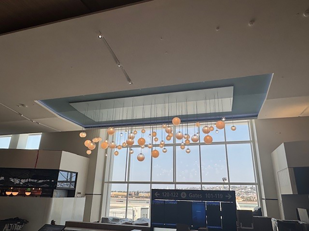 · Commissioned art pieces by seven artists. The art pieces placed within the terminal are A Day in the Sun, Torrey Pines, Sandcast, Vessels of Light, and Time Interwoven. External art is the Rise Jellyfish and Migrations.