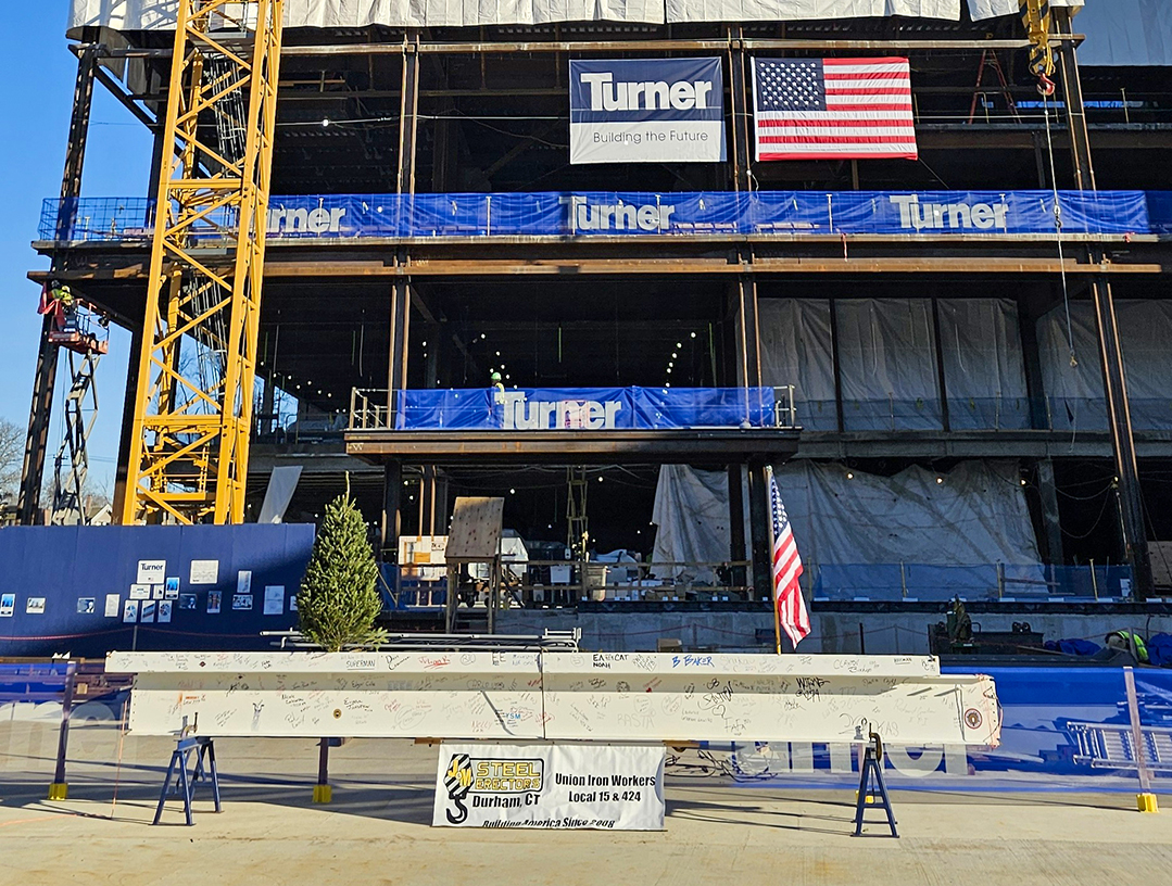 Turner Construction Company celebrated the topping out of McGivney Tower, marking the completion of vertical construction of the Yale New Haven Health St. Raphael Campus’ Adams Neurosciences Center. The $838 million project is designed to elevate the standard of neurological care in Connecticut.