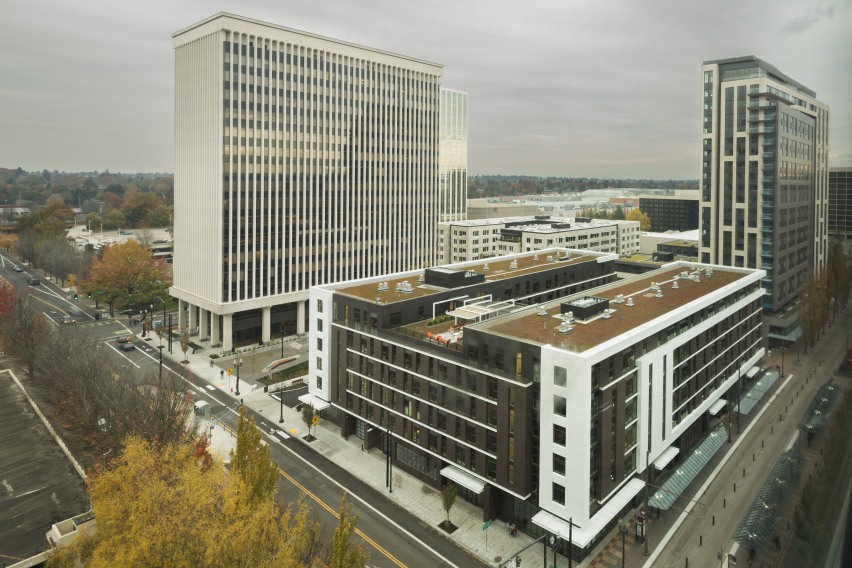 The urban neighborhood also included 50,000 sq. ft. of retail space, over 650 residential units, immediate access to the Portland MAX light-rail and Portland Streetcar system, a community plaza, and 38,000 sq. ft. of green roofs spanning across all three buildings.