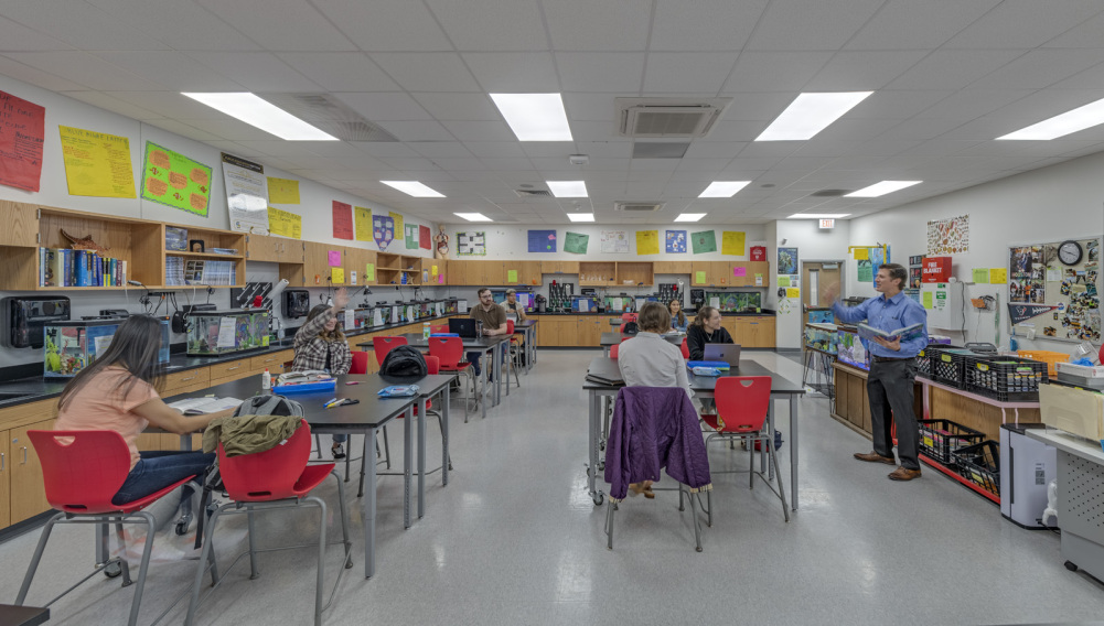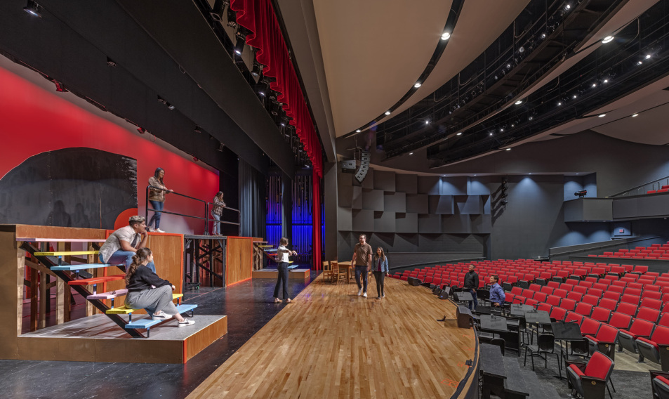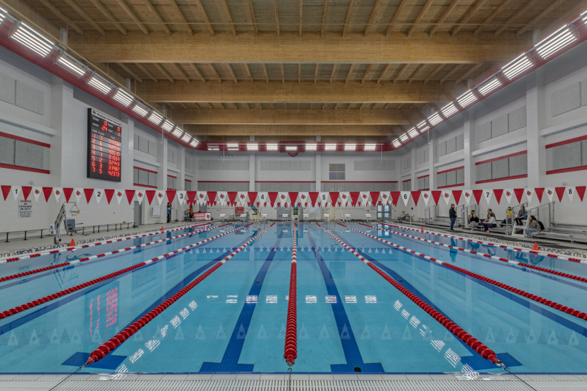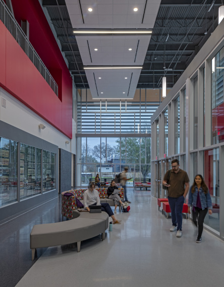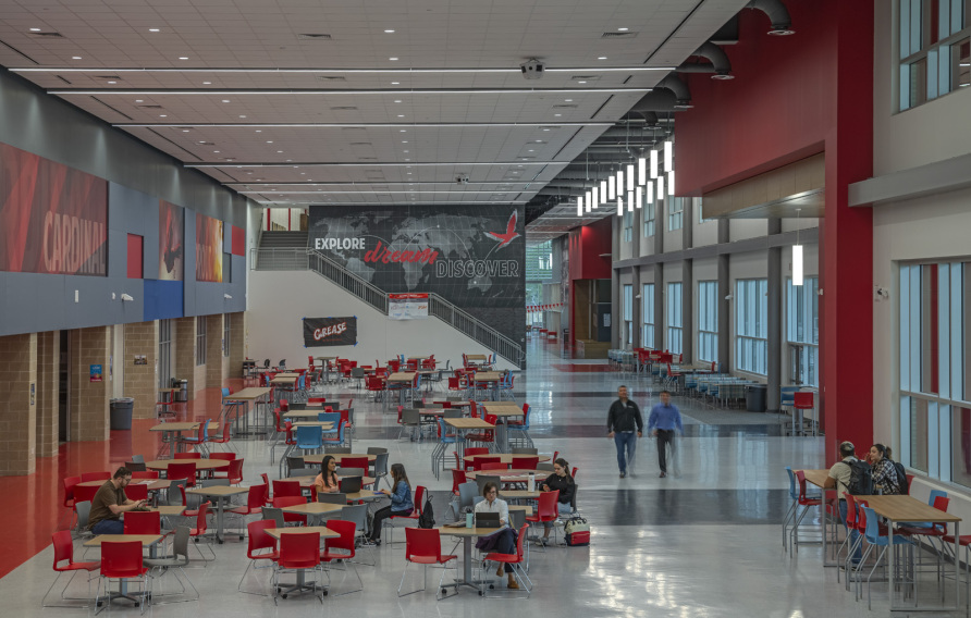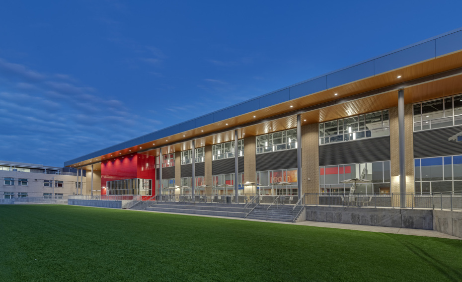 Outdoor amenities include a synthetic turf football field with six-lane track and off-site baseball and softball fields. Notable features include the glulam “Main Street” Natatorium roof with direct access to the campus’s central multipurpose courtyard, VRF mechanical systems, and a four-story parking garage to maximize site efficiency. The project is LEED v4 Certified.