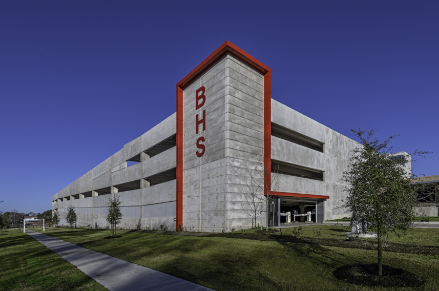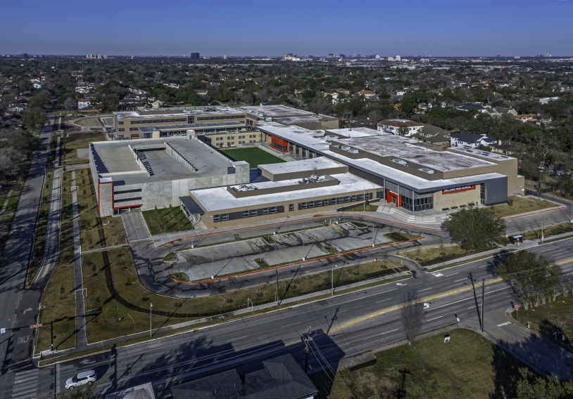 The new Bellaire High School was constructed within the existing campus, adjacent to residential properties along bordering streets. Located within a 100-year floodplain, the 396,378 sq. ft. phased project features a three-story classroom wing, JROTC center, CTE and computer labs, a two-story competition and auxiliary gym with locker and shower rooms, a Natatorium with diving well, a theatre/Black Box Center, dance, choral, guitar, and piano spaces, debate/music rooms, and an auditorium with mezzanine.