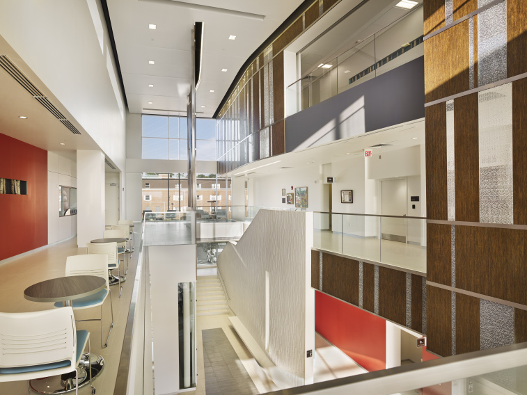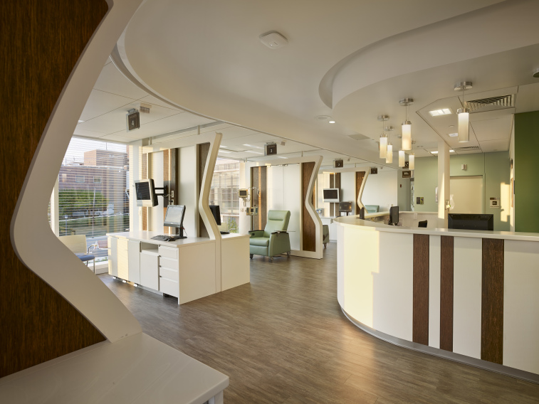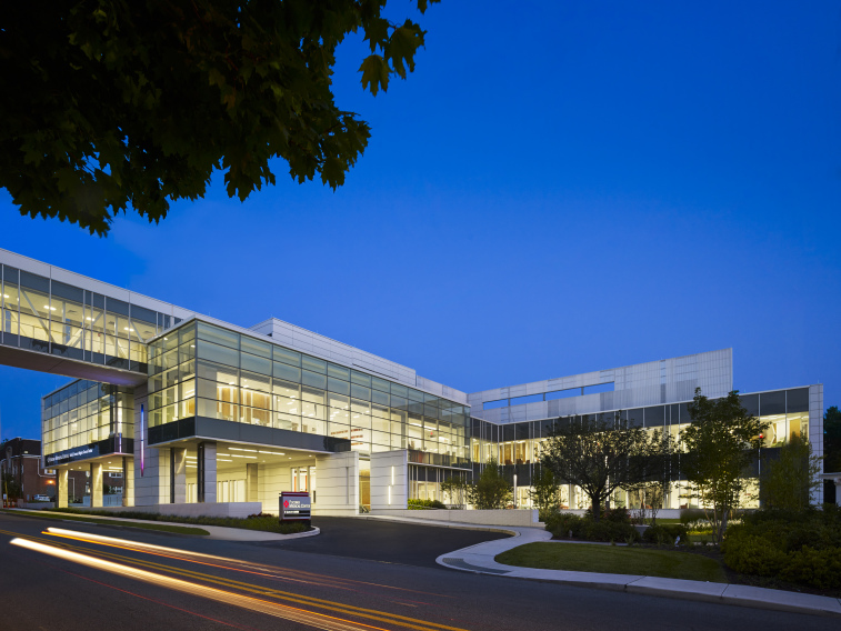 The project included the complex construction of an enclosed bridge over East Brown Street, connecting the cancer center to the main hospital. The building contains diagnostic and radiation treatment on the first floor, including two linear accelerators, and office space and infusion therapy on the second floor. The building also contains a grand atrium, a conference room, offices, exam rooms and consultation spaces, an internet café, and a meditation room.
