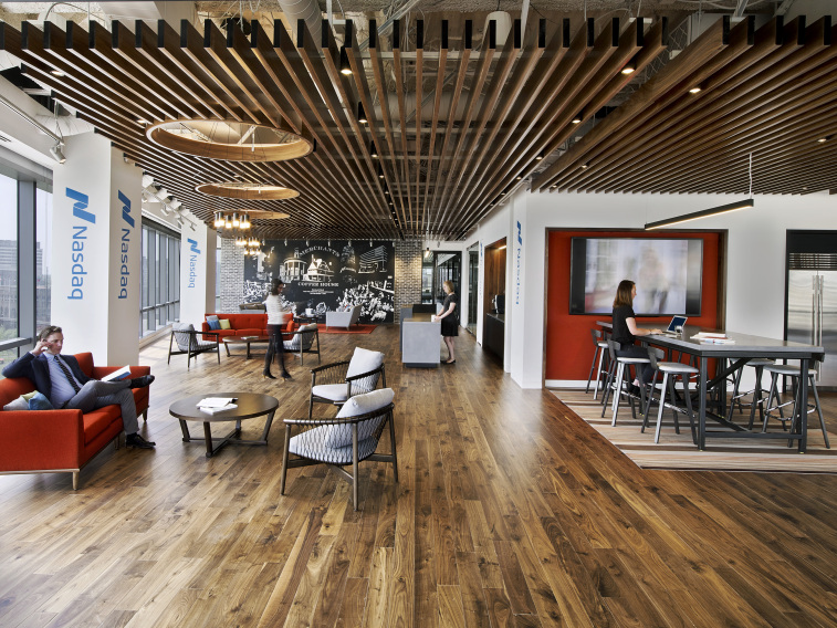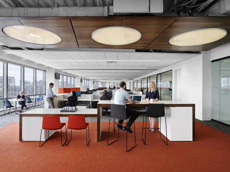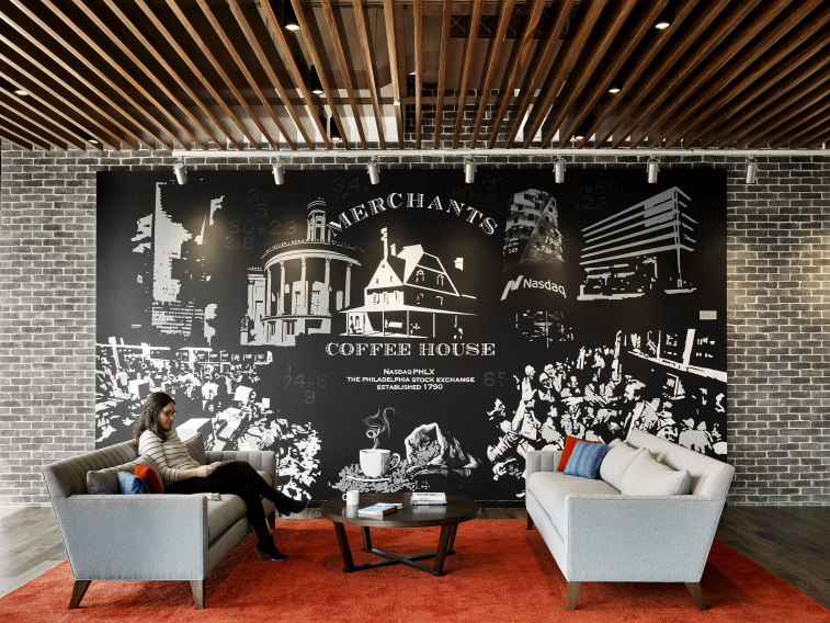 This project involved the build-out of 75,000 sq. ft. of interiors across three floors of the FMC Tower at Cira Centre South (also built by Turner). The scope included a reception security desk, a monumental three sided cantilevered interconnecting stair, a centralized meeting room, work stations, offices, collaboration areas, mothers’ rooms, pantries, print/copy rooms, and trading floors. A CDC (data center), NOC and multiple IDF rooms on each floor are also key components of the fit-out. Supporting the data center is a 800KW generator and dual 300KVA backup UPS’s. The data rooms have redundant Liebert units supported by a Multistack chiller system located in the buildings mechanical room. The trading floor is built on a raised flooring system and includes water cooled trader desks. The ceiling system in the open areas include a combination of open acoustical clouds, wood panels and acoustical baffle systems. Flooring finishes include tile flooring, carpet tile, “Maharam” cork and felt and walnut wood flooring. A Clestra double glazed office front system with both sliding and swing doors are used to meet the acoustical requirements.