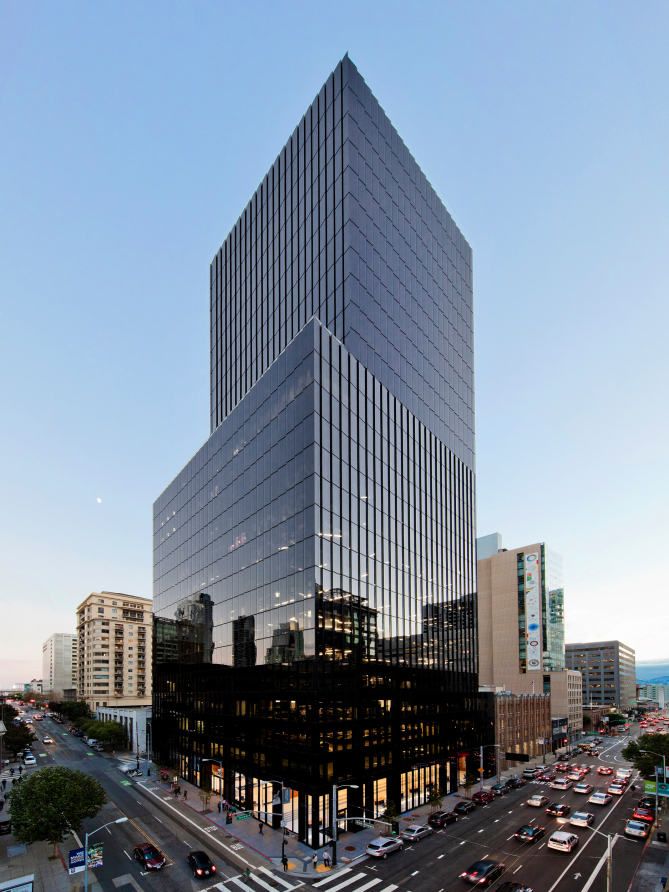 222 Second Street was added to the San Francisco skyline in 2015. This 26-story Class A office tower in downtown San Francisco is 523,000 square feet. The building includes two levels of underground parking, a large public space, retail space on the ground floor, 26 elevated office floors, and a mechanical penthouse. Supported on a mat foundation, the structural steel building is clad in a shingled curtainwall system. LEED Gold certified.