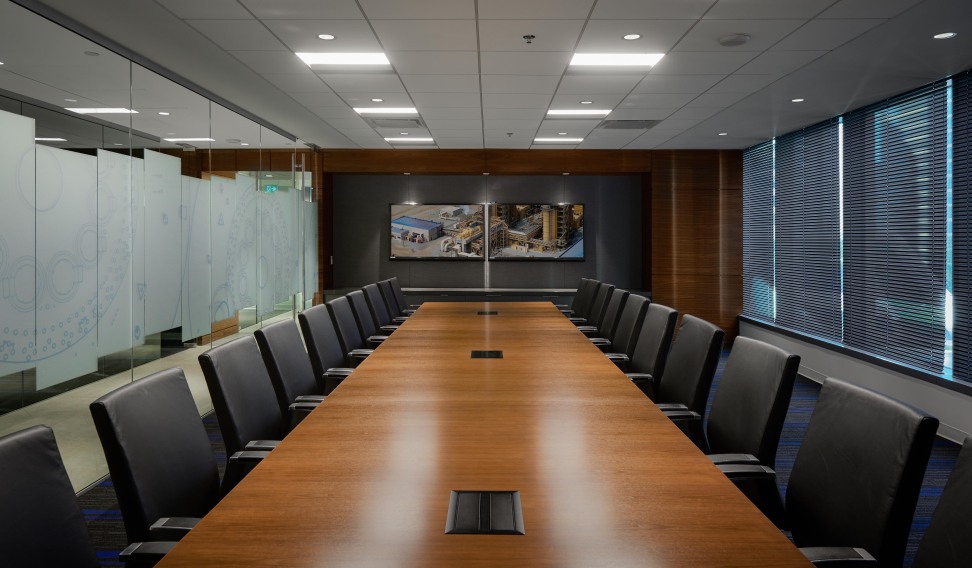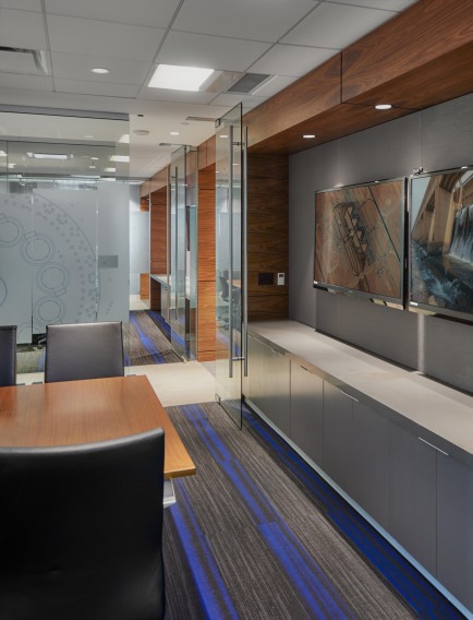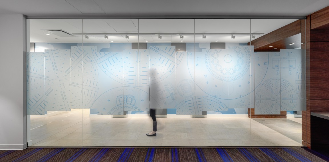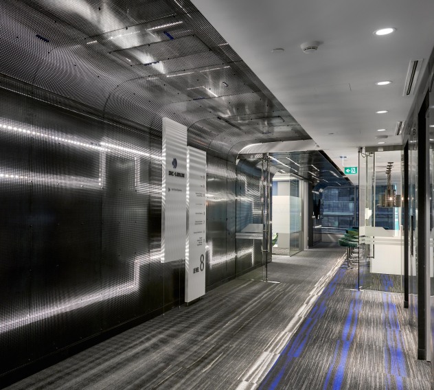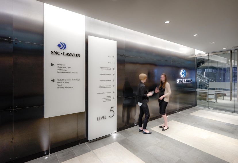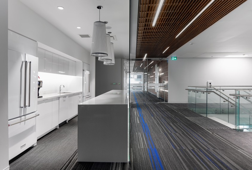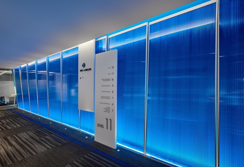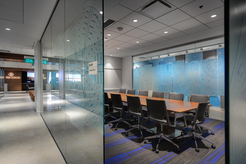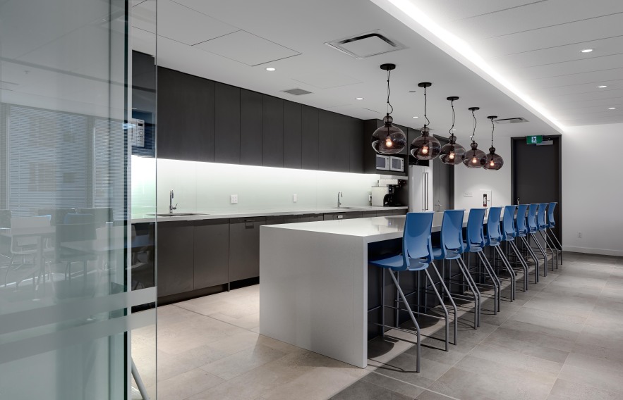 SNC Lavalin Inc.’s new Vancouver Headquarters is just under 130,000 sq. ft. over 8 floors in Vancouver’s downtown core at 745 Thurlow St. Similar to Deloitte, this was a fit-out in a new building. Each floor has a typical floor plate with a large main boardroom, kitchenette area, print/copy space and private offices. Floors 5/6 were a custom design that included a new steel interconnecting staircase, executive boardrooms, custom walnut wood paneling and wood slat ceilings. The designer for the project created eight unique elevator lobbies that would highlight the market segments of SNC Lavalin projects. Each design element for this project needed to be well coordinated and therefore Turner provided over two-dozen mock-ups for this fast track project to ensure that the design intent was correctly interpreted and implemented on site. Turner managed 37 trades with over 100 trades people on site at the peak of construction. The construction was completed in four phases to allow for SNC move-in despite late turnover by the base building contractor. One of the major challenges for the project was getting materials on and off the site. At the time of the project base building did not yet have occupancy and was still active in the building and several other tenants were also fitting out. Recognizing this limitation, Turner implemented an “everything on wheels policy” and built garbage bins that could be moved around and roll into the elevator. This meant that items could be stockpiled and moved around on-site until the elevator was free. Another major challenge was that the project started before the base building had received occupancy/commissioned the systems so we were mandated to use the base building trades. This burdened Turner with an underperforming mechanical trade. To address this, we re-organized our team structure to support this trade to manage their work.